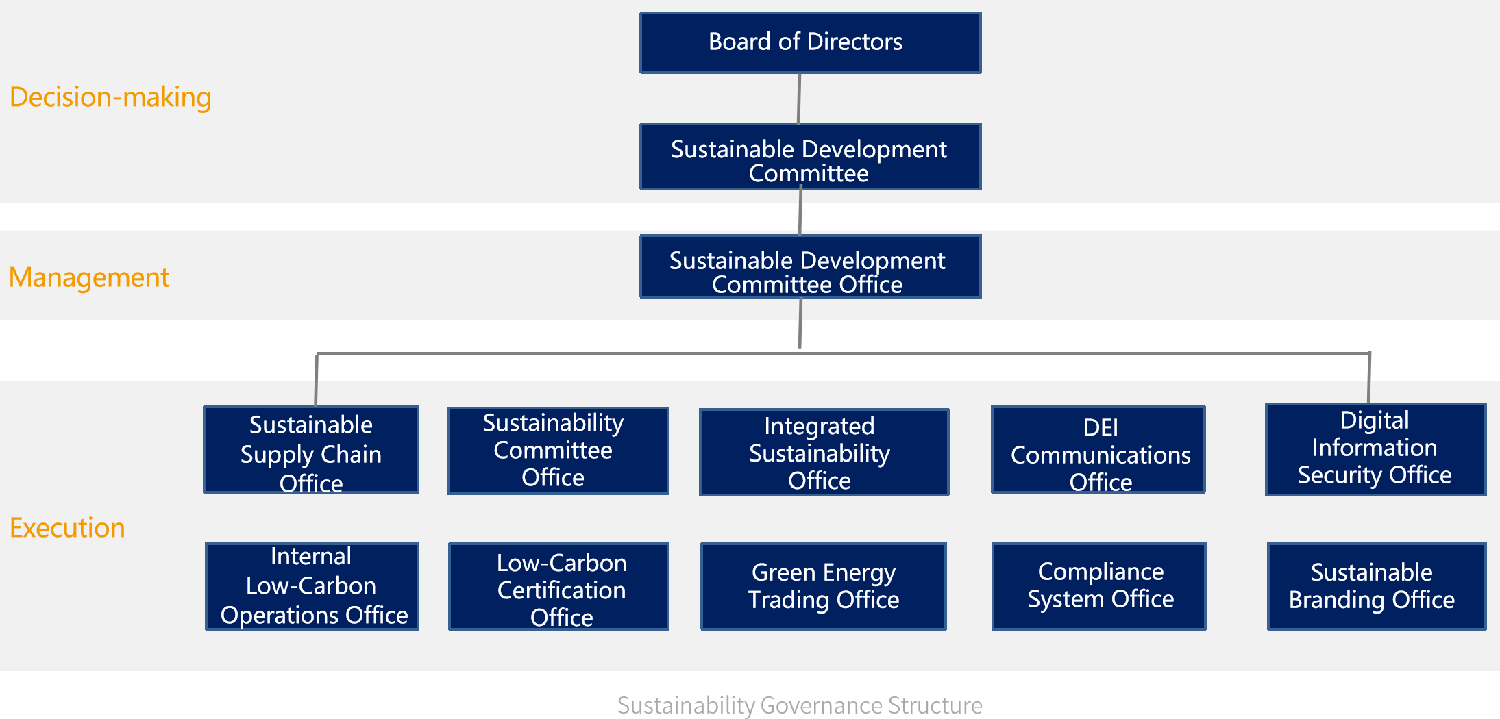 The company always places sustainability at the core of corporate development and has established a comprehensive sustainability governance structure, providing strong guarantees for comprehensively promoting and implementing ESG-related matters. Under the Board of Directors, a Sustainability Committee is established, responsible for reviewing the company's sustainability strategy, policies, goals, and related risks, supervising the implementation of ESG topics, and regularly reporting to the Board. A dedicated office and ESG implementation teams are specially set up under the Sustainability Committee to provide guiding methods for the implementation of the company's ESG work.