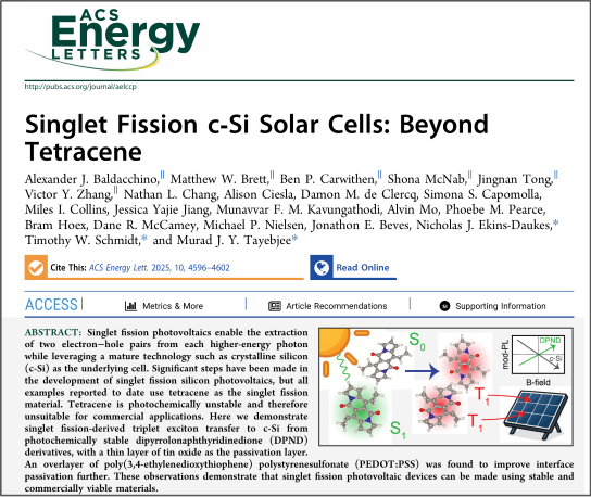 2025 年 10 月,一道新能与澳大利亚新南威尔士大学(UNSW)光伏研究中心联合研究效率可达40%高效电池项目--基于单线态分裂的多光子高效太阳电池(Singlet Fission on Silicon,简称SFOS)研究取得关键突破,UNSW团队发现了性能稳定、量子产率高、与硅具有良好能带匹配的新型单线态分裂材料DPND,相关研究成果已发表于国际能源领域顶级学术期刊《ACS Energy Letters》。此次成果的发表标志着多光子 SFOS 高效太阳电池基础研究获得重大突破,为后续在硅上制备高效多光子SFOS 太阳电池产业化奠定了重要基础。