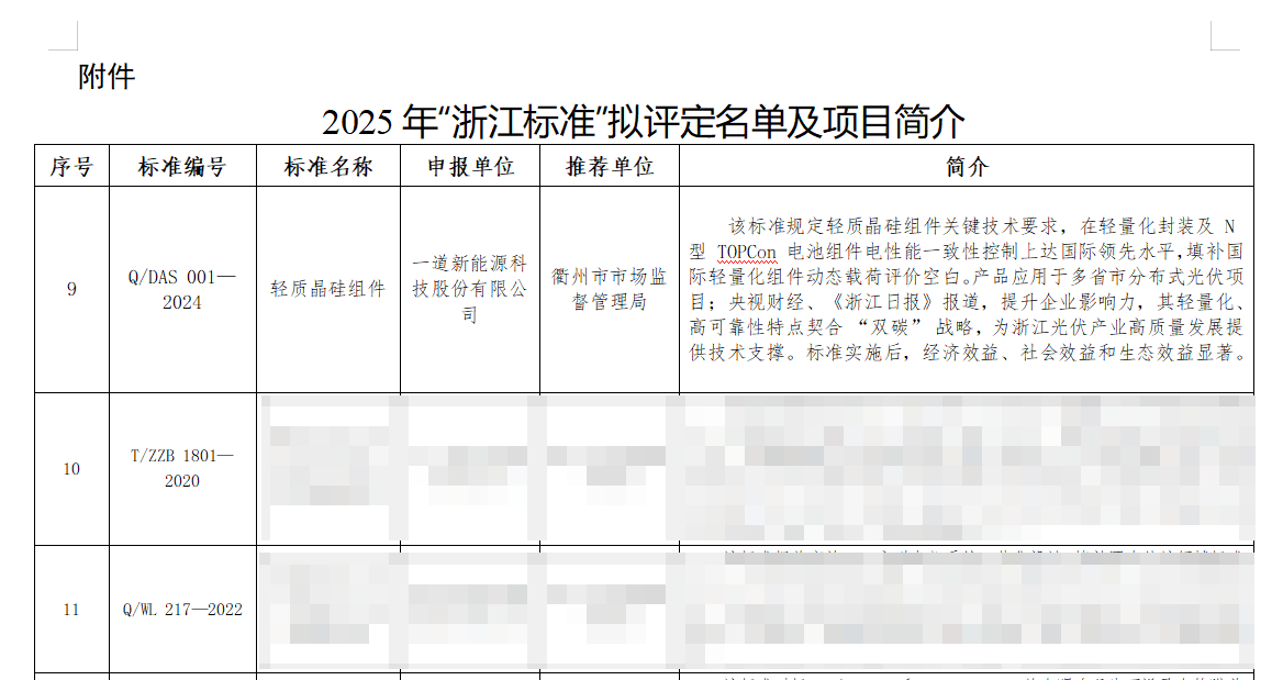 近日,浙江省市场监督管理局公布 “浙江标准” 评价结果,由一道新能主导制定的企业标准 Q/DAS 001-2024《轻质晶硅组件》凭借 “国内领先、国际一流” 的技术水平与显著的产业价值,成功获评 “浙江标准”。作为主导和参与超 130 项国内外标准编制的光伏领军企业,一道新能通过技术攻关、标准输出、产业协同的成熟路径,再次实现先进技术向标准的高效转化,标志着公司在轻质光伏组件领域从技术引领者向技术与标准双引领者的跨越。