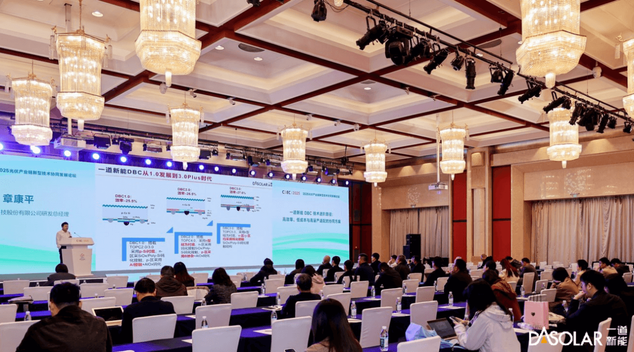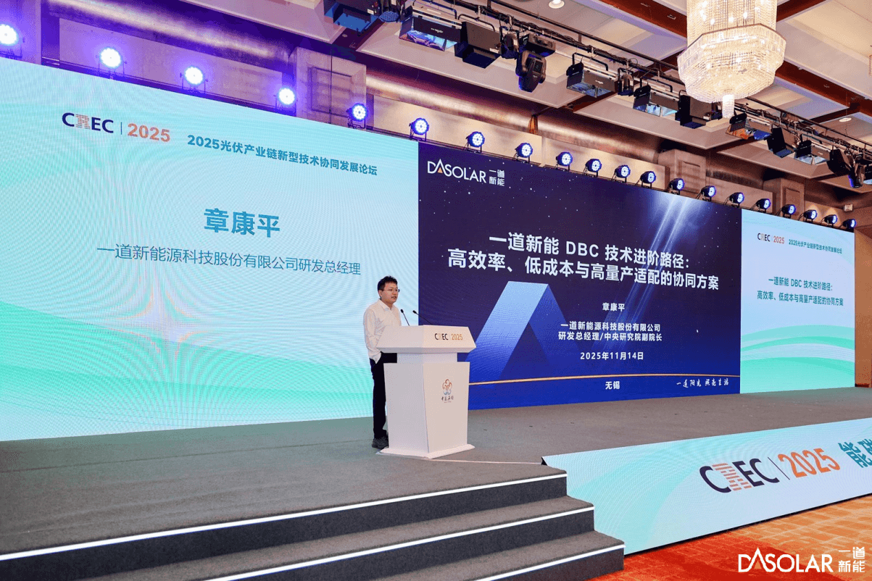 11月14日,“2025光伏产业链新型技术协同发展论坛”在江苏无锡成功举办,无锡新能源商会与摩尔光伏联合主办此次行业盛会。一道新能源科技股份有限公司研发总经理章康平受邀出席,发表《一道新能 DBC 技术进阶路径:高效率、低成本与高量产适配的协同方案》主题报告,重磅发布Diamond“黑曜”DBC3.0Plus技术最新成果——电池认证效率27.77%、组件全面积转换效率24.61%,双破行业纪录,凭借高效率、低成本、高量产适配的三重核心优势,引发全场热议。