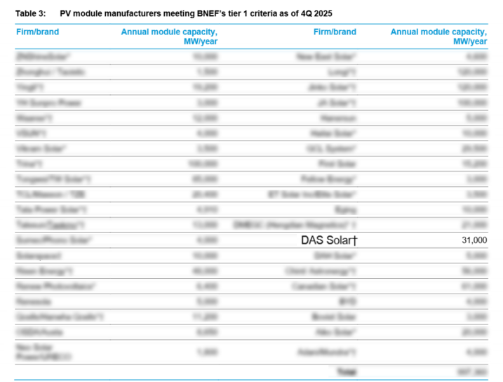 近日,彭博新能源财经(BloombergNEF,以下简称“BNEF”)公布了 2025 年第四季度全球光伏组件一级供应商(Tier 1)名单。一道新能凭借在技术创新、智能制造、绿色价值及全球化运营等维度的强劲实力,再度稳居Tier 1行列,实现 2025 年“四连入榜”。